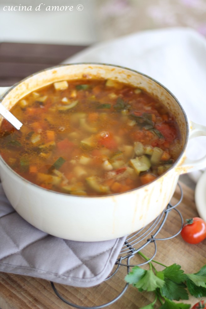 Was passt besser in den Frühling als eine leckere Gemüsesuppe. Minestrone ist wahrscheinlich die bekannteste Gemüsesuppe aus Italien.  Minestra bedeutet Suppe und in Italien kann die Minestrone je nach Region anders ausfallen. Da gibt es zum Beispiel die Minestrone Genovese die wird hauptsächlich mit grünem Gemüse gemacht. Es gibt auch eine Sommer Minestrone (Minestrone estate) oder Winter Minestrone ( Minestrone inverno).