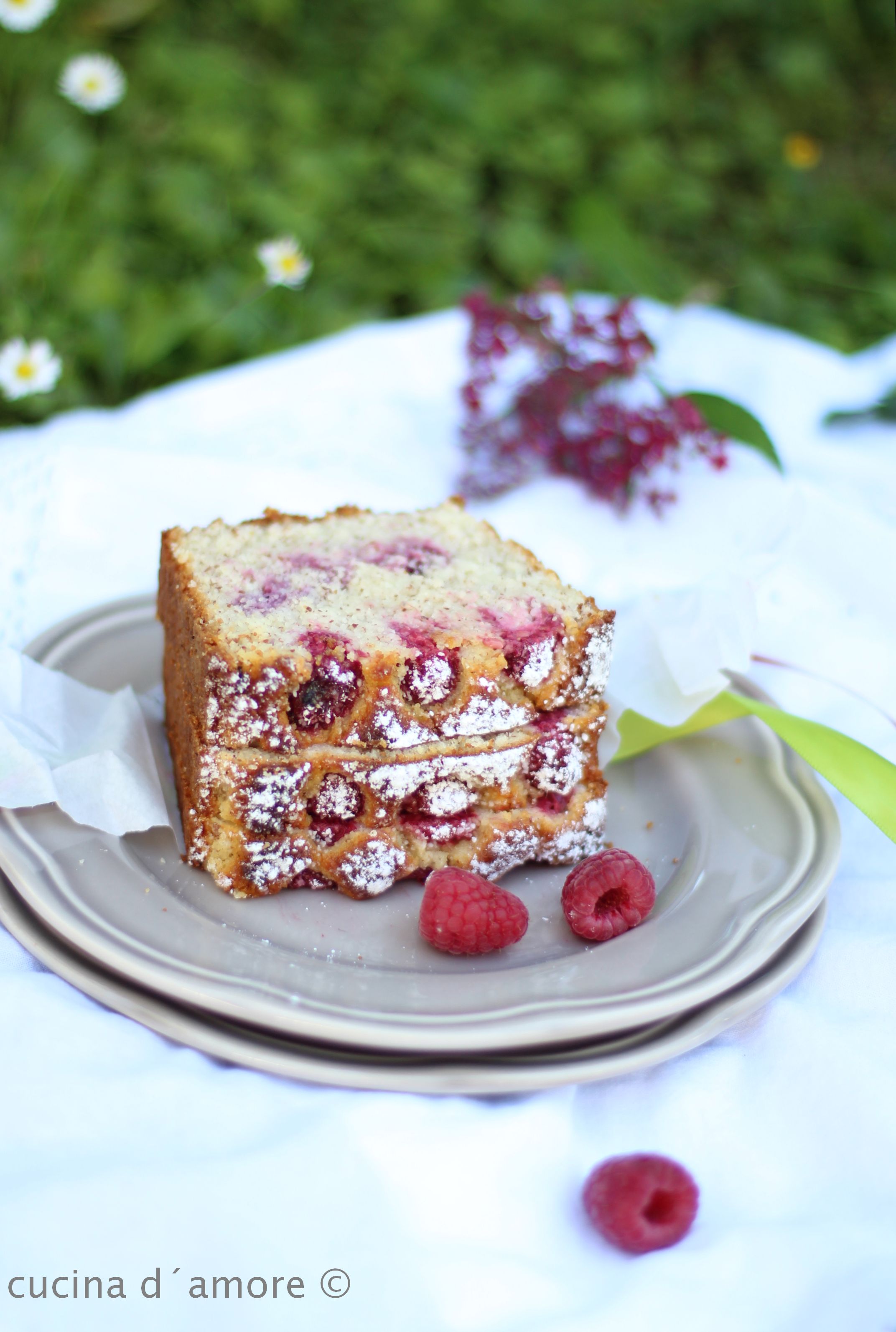 Es gibt einen leichten Himbeer-Grieskuchen der perfekt für ein Picknick im Grünen geeignet ist.
