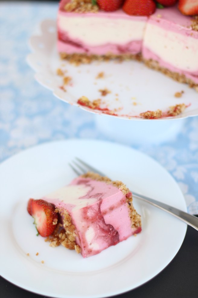 Die restlichen Erdbeeren bis auf einige schöne zum verzieren Pürieren und mit dem Mascarpone, dem Quark und dem restlichen Zucker und dem Vanillezucker gut vermischen. Die zehn Blätter Gelatine ausdrücken und ebenfalls bei niedriger Temperatur auflösen. 2-3 Esslöffel der Creme unter die Gelatine rühren und dann diese Mischung unter die restlichen Creme rühren. Jetzt den Kuchen Boden aus dem Kühlschrank holen und mit etwas Quarkmasse bedecken ein wenig Erdbeer Püree Draufklecksen und beides mit einer Gabel marmorieren. Auf diese Weise weiter verfahren bis beide Cremes aufgebraucht sind. Jetzt darf die Torte für mindestens 4 Stunden oder sogar über Nacht in den Kühlschrank. Dann den Springformrand lösen und die Torte mit den restlichen Erdbeeren und eventuell Blüten dekorieren.