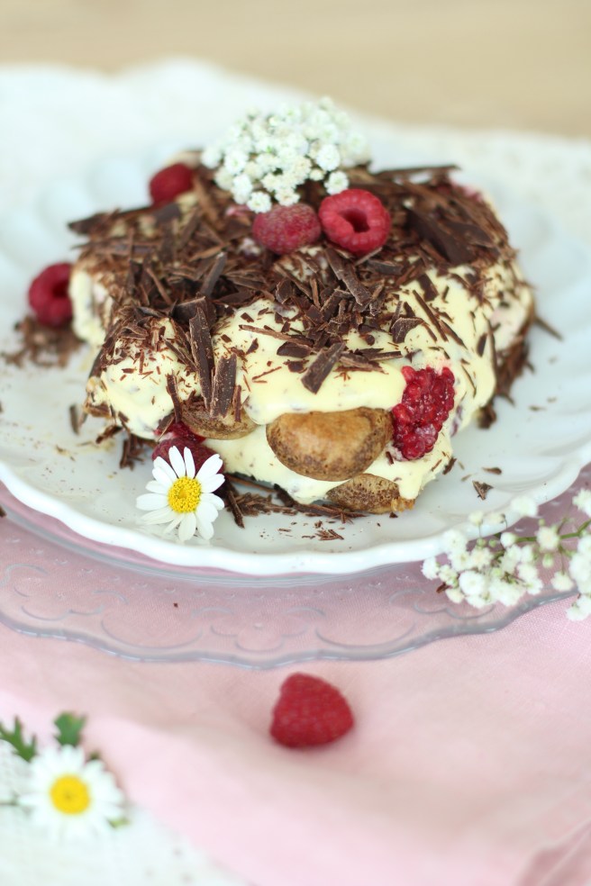 Schokolade fein hacken und mit den Himbeeren unter die Creme heben.